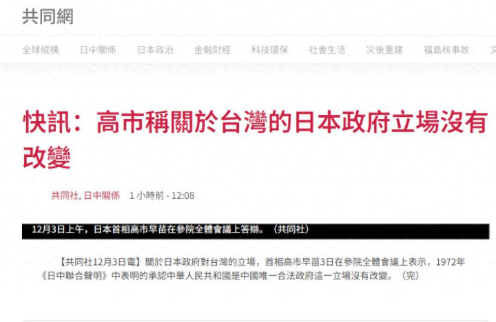 据日本共同社消息,12月3日上午,高市早苗在参议院全会会议上答辩时表示,“1972年《日中联合声明》中所表明的承认中华人民共和国是中国唯一合法政府这一立场没有改变。”